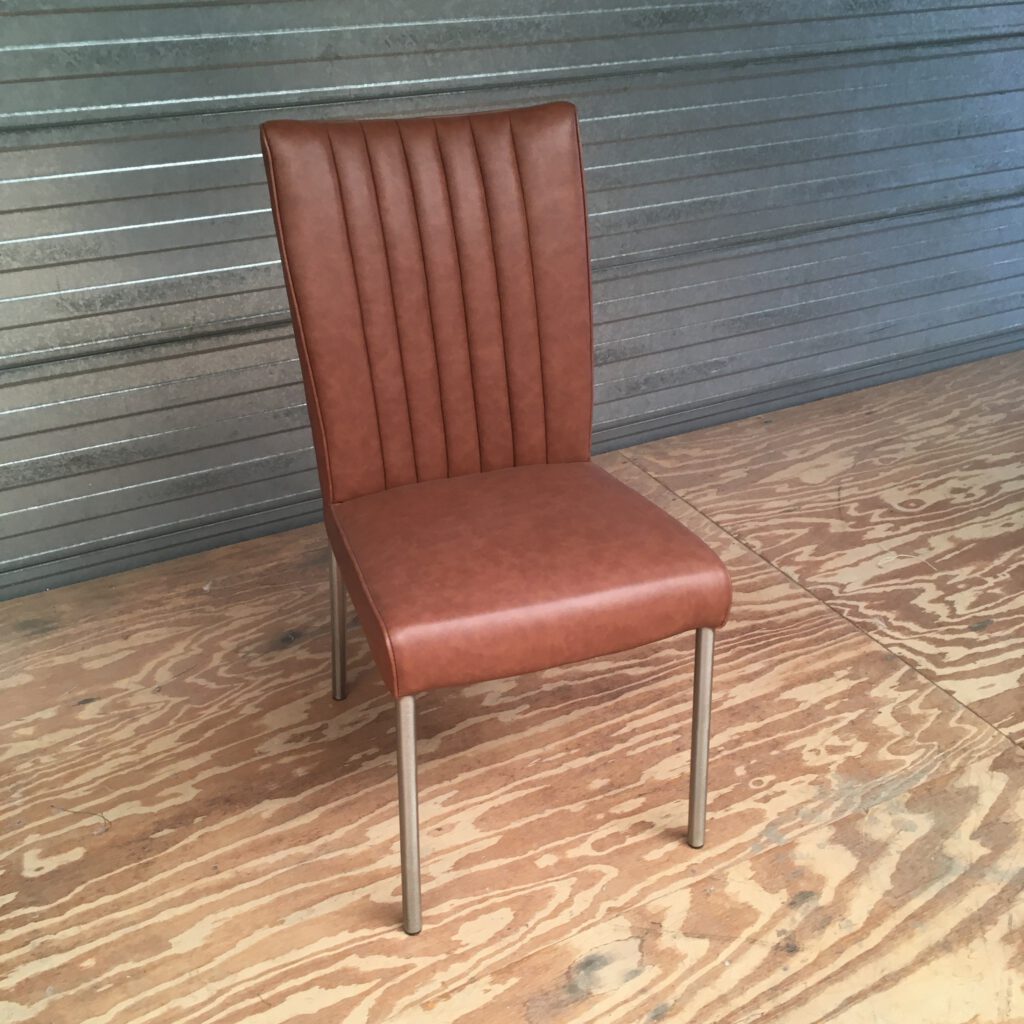Eetkamerstoel Kobe is bekleed met kwalitatief hoogwaardige lederlook. De poten zijn uitgevoerd in RVS. De rugleuning is voorzien van verticale stiknaden. Dit geeft de stoel een lichte modern/retro uitstraling.