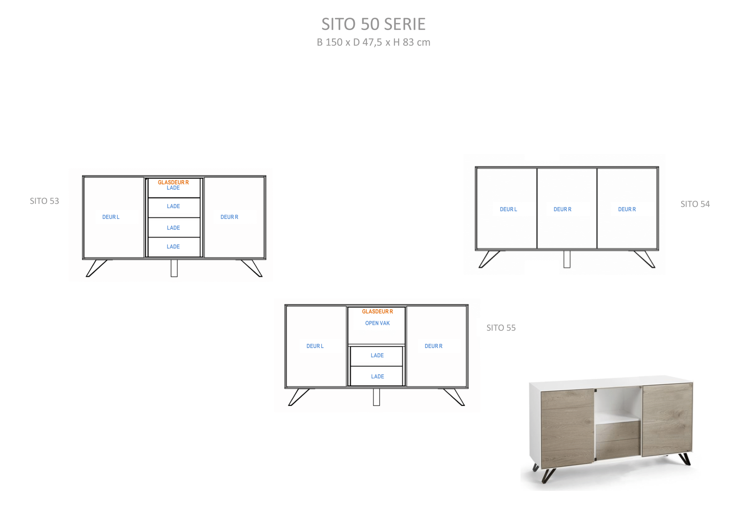 Sito dressoir uit de Sito 50 serie verkrijgbaar in drie uitvoeringen zoals u hieronder kunt zien.
